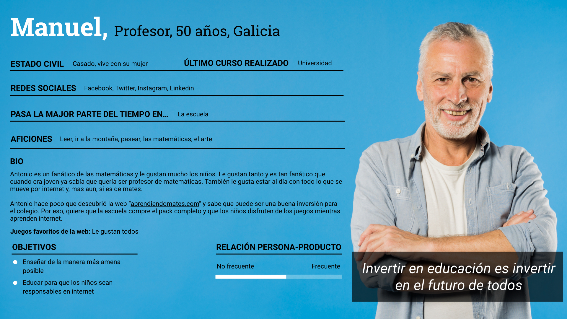 En el proceso de diseño se empezó por crear a las personas para saber que tipo de usuario utilizará la web. Estas personas nos ayudarán a crear una guía de estilo acorde a al publico al que nos dirigiremos.