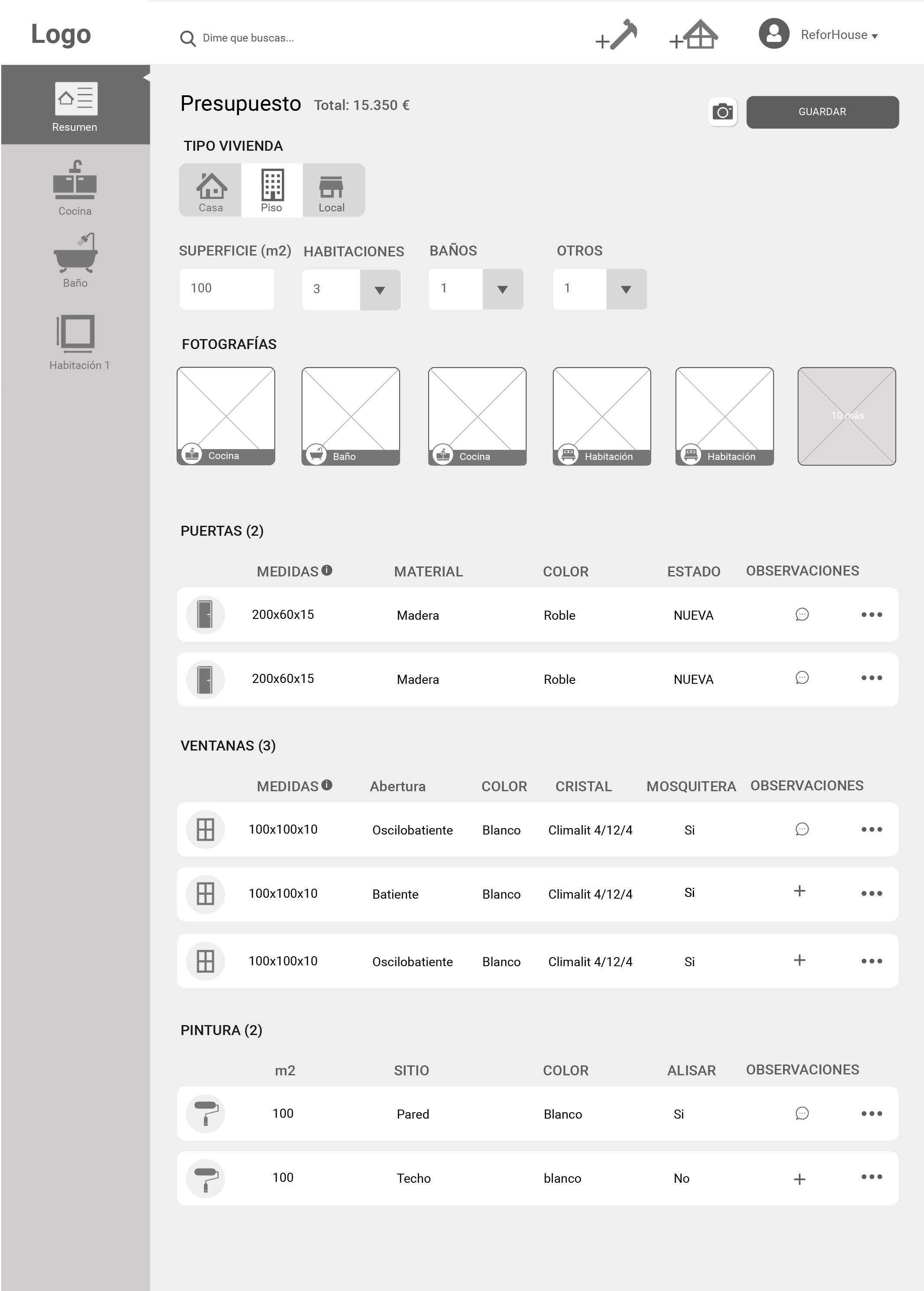 Si se añade una estancia, aparecerá el nombre junto con un icono en la barra lateral izquierda. Cuando se añade un tipo de habitación, las páginas están prediseñadas y piden los datos que se consideran importantes para hacer una reforma.